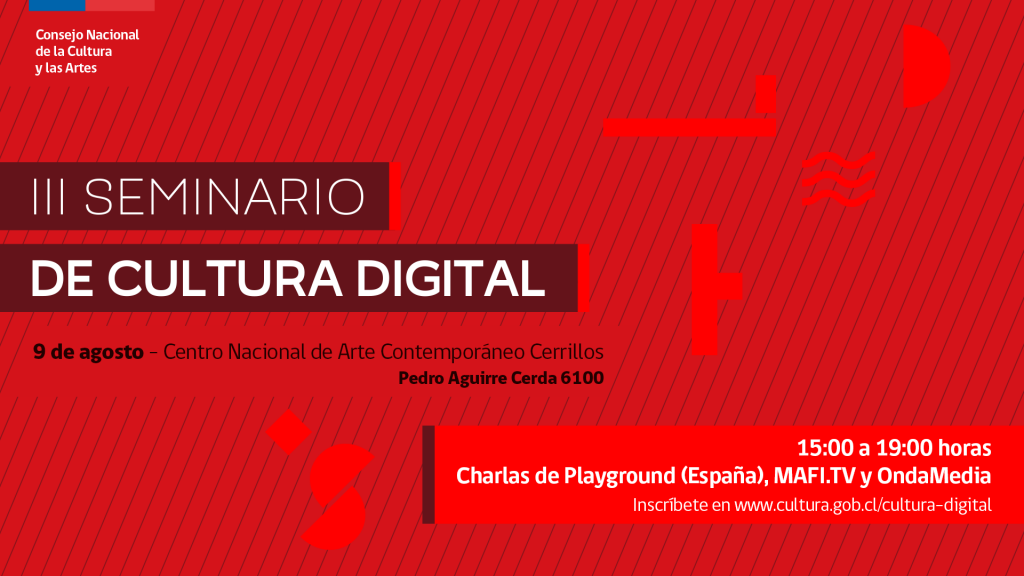 Con la participación de Playground, Mapa Fílmico de Chile (MAFI.TV) y la plataforma Ondamedia, recién lanzada por el Consejo Nacional de la Cultura y las Artes, se realizará el Tercer Seminario Internacional de Cultura Digital este 9 de agosto en el Centro Nacional de Arte Contemporáneo Cerrillos.
